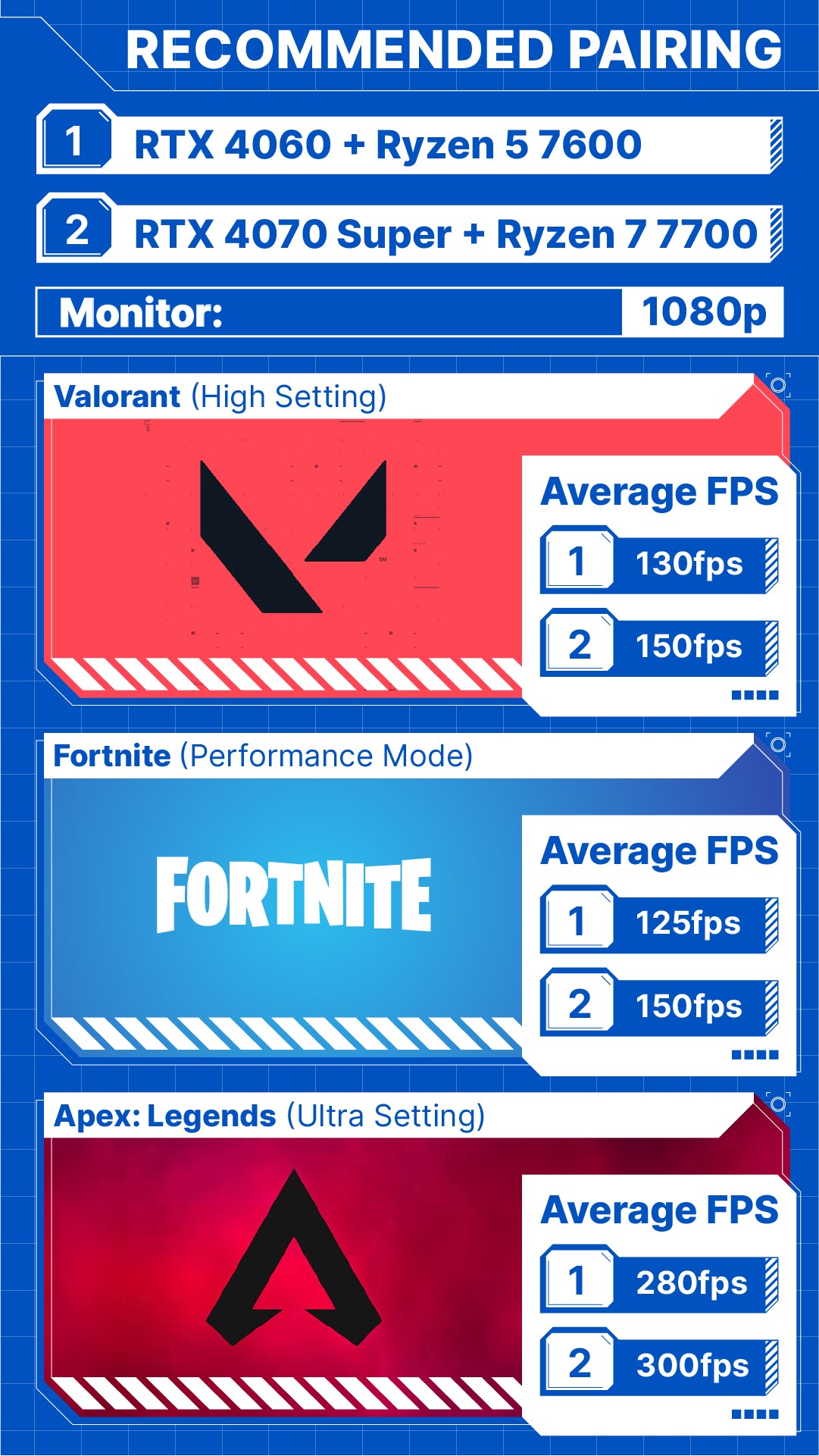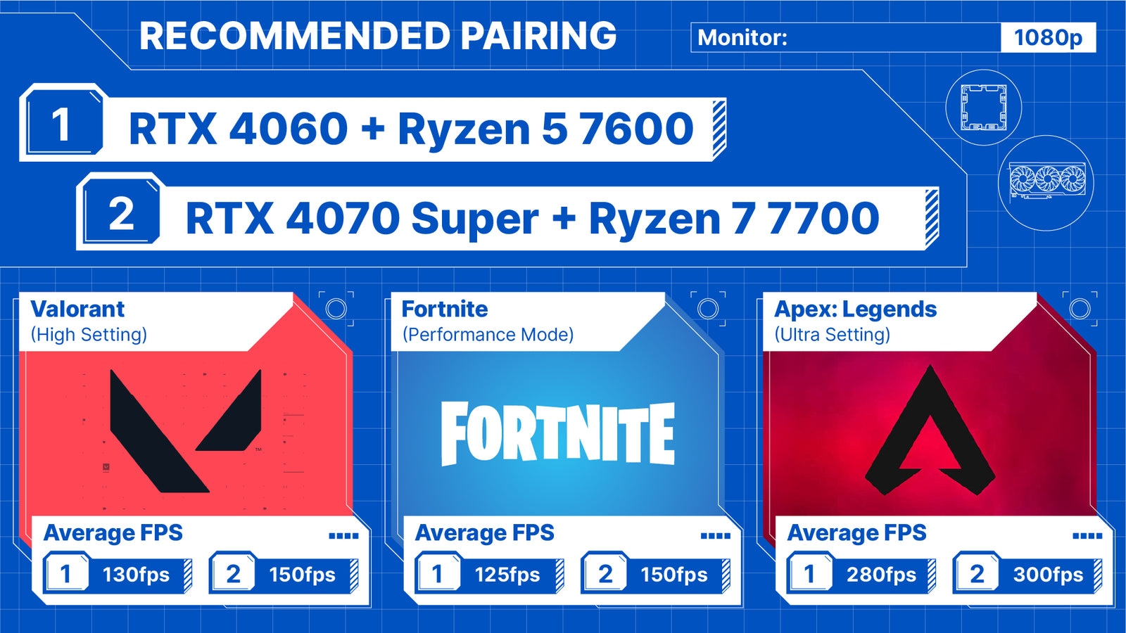 These are 2 of our suggested pairing for your CPU (processor) and GPU (graphics card) with their respective FPS. It is important to pair the CPU and GPU correctly to avoid bottlenecking, ensuring that every dollar is well spent.